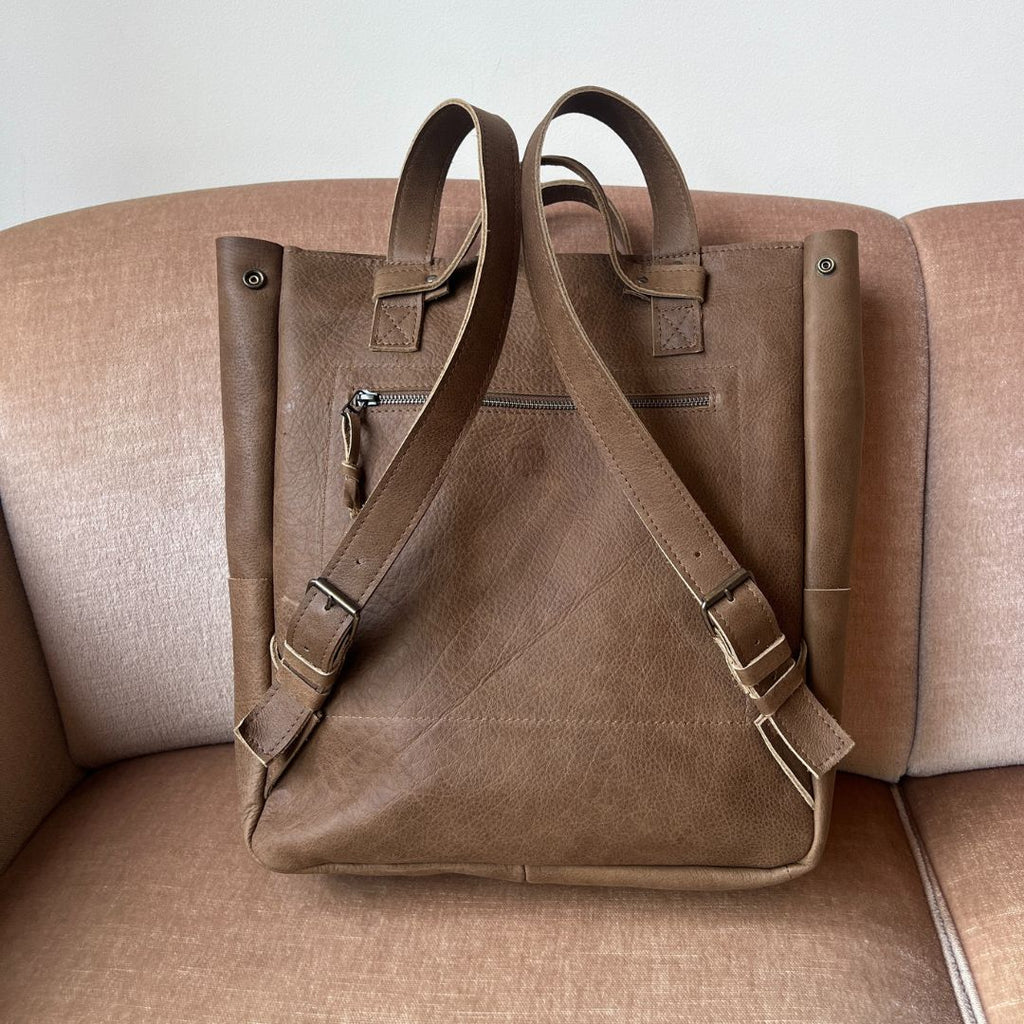 Stijlvolle tijdloze praktische rugzak van gered leer™ in het Monsak atelier in Amsterdam