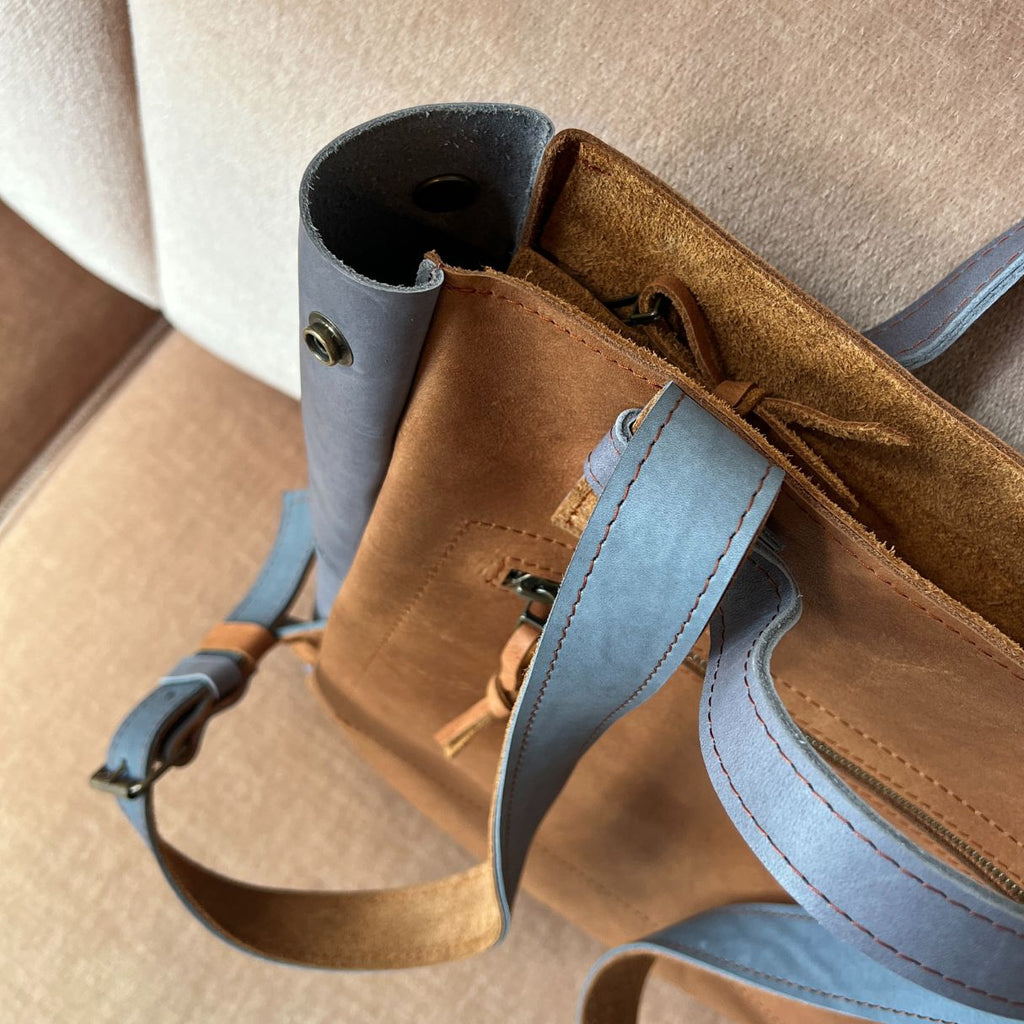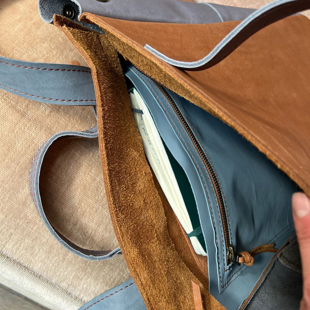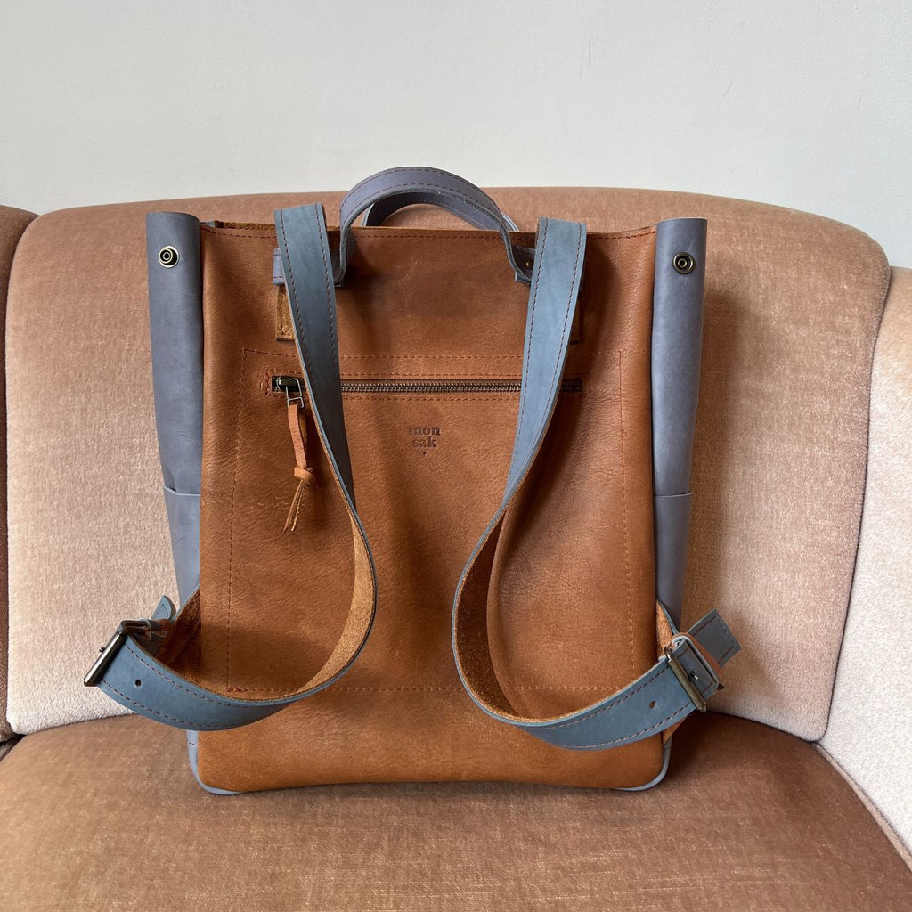 Stijlvolle tijdloze praktische kleine rugzak van gered leer™ in het Monsak atelier in Amsterdam